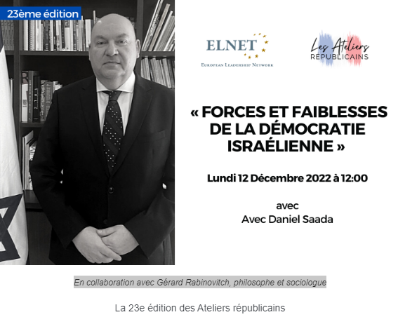 | S.E. Daniel Saada intervient sur les « Forces et faiblesses de la démocratie israélienne » Alors que Salah Hamouri, expulsé ce dimanche matin d’Israël – certains osent dire « déporté », – va arriver en France, relançant les diatribes contre l’Etat d’Israël, alors que s’élèvent des cris contre « l’extrême droite israélienne », alors que les Nupes viennent d’adresser un courrier à la Ministre des Affaires étrangères pour contester l’abstention de la France sur une résolution de l’ONU visant une énième fois Israël, alors que la campagne de boycott d’Israël ciblant désormais l’enseigne Carrefour, qui arrive en Israël, s’intensifie,alors que la vaste campagne de propagande durant la Coupe du Monde au Qatar, autour du drapeau palestinien, qui veut dire « Palestine de la mer au Jourdain », a été vue dans le monde entier, il est temps de ne pas laisser s’installer ce bruit de fond anti Israël et anti juif. Une interview de S.E. Daniel Saada sur les « Forces et faiblesses de la démocratie israélienne », en collaboration avec Gérard Rabinovitch, philosophe et sociologue, dans le cadre des Ateliers Républicains d’Elnet |
