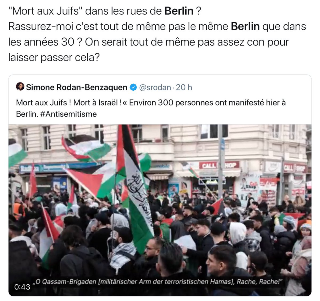 Dans la même séquence, relayée par ailleurs par plusieurs médias allemands tels « Die Zeit » ou le « Tagesspiegel », on entend également des participants rendre hommage aux « Brigades Qassam », branche armée du Hamas, listée « organisation terroriste » par l’Union européenne et les États-Unis.