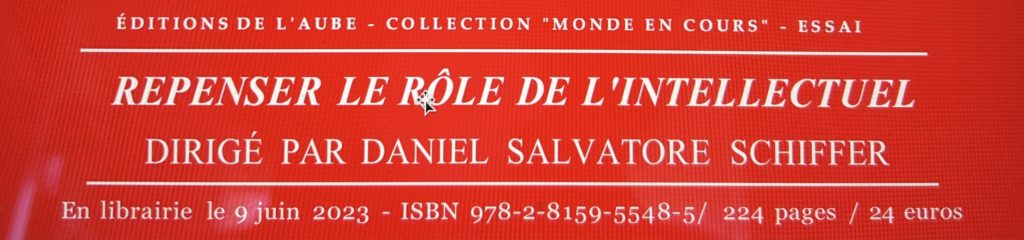 A paraître en juin 2023, aux Editions de l’aube, et sous la direction de Daniel Salvatore Schiffer, l’ouvrage collectif « Repenser le rôle de l’intellectuel », avec, entre autres, Luc Ferry, Nathalie Heinich, Edgar Morin, Dominique Schnapper, Robert Redeker, Belinda Cannone, Pierre-André Taguieff, Sabine Prokhoris, Frédéric Schiffter, Sophie Chauveau, Renée Fregosi, Elisabeth Weissman, Yves Namur…
