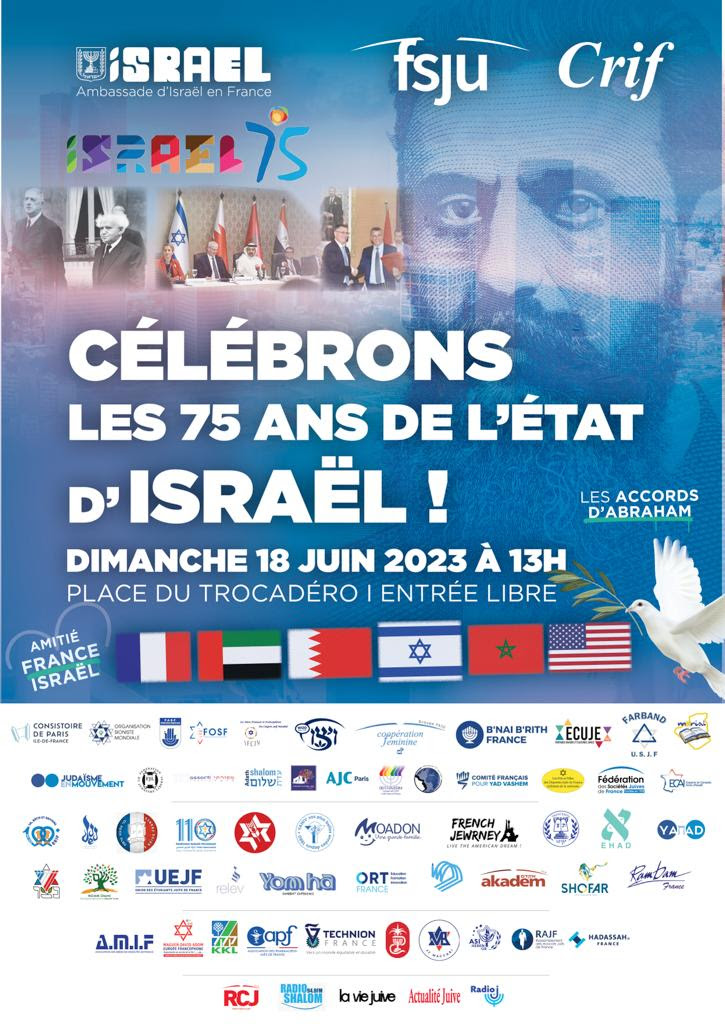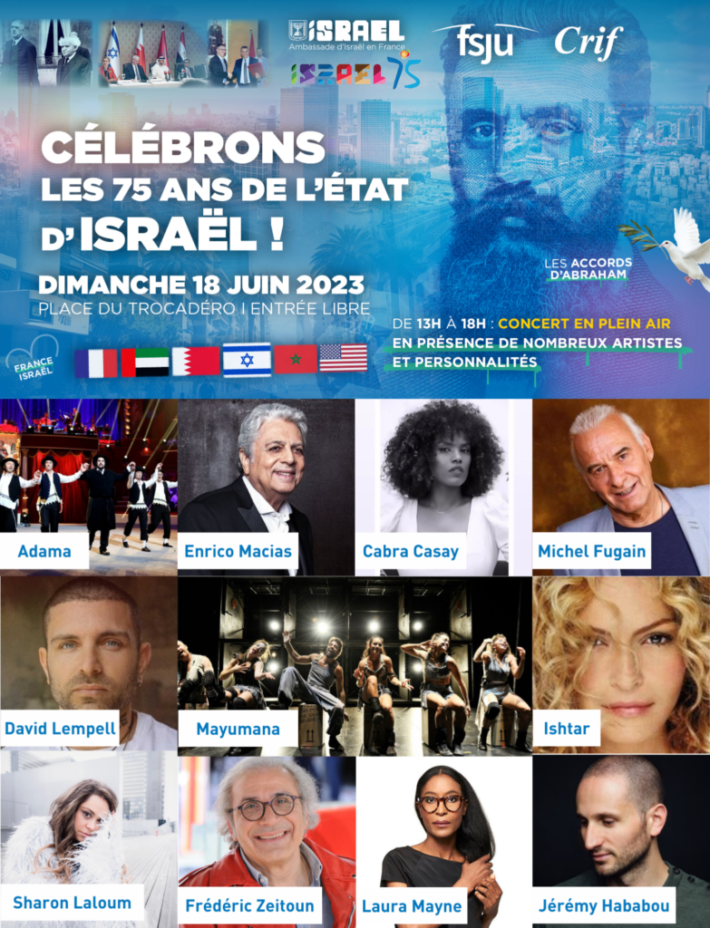 Dimanche 18 juin à 13h, Place du Trocadéro, Paris 16e: Organisée par le FSJU et le Crif, avec le concours de l’Ambassade d’Israël en France, cette fête populaire et familiale vous a préparé un programme à ne pas manquer : plateau artistique exceptionnel, hommage à l’amitié France-Israël et aux Accords d’Abraham avec des représentants des Ambassades et personnalités, karaoké sur les tubes israéliens de l’Eurovision, et bien d’autres surprises…