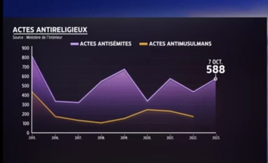 Source Ministère de l’Intérieur français : graphique éloquent des actes antisémites commis en France en comparaison des actes anti musulmans quand certains essaient de comparer et de relativiser. D’autant plus impressionnant quand on connaît le poids démographique des juifs face aux musulmans en France: