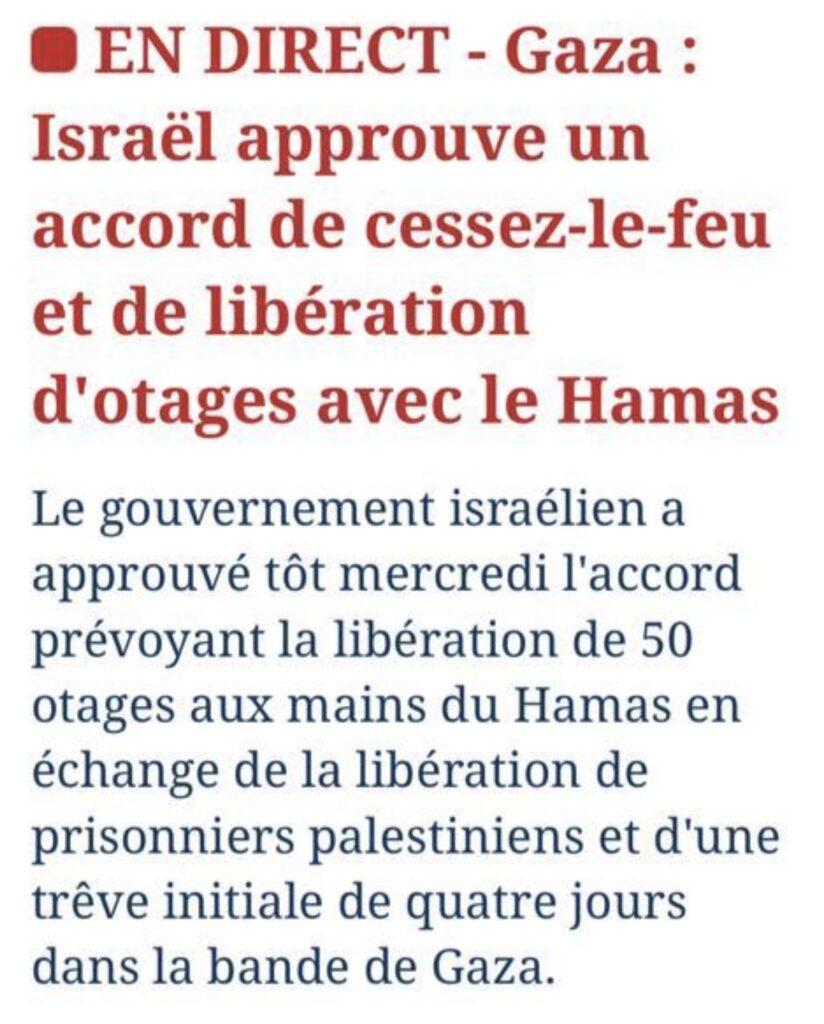 Il n’y a pas de cessez le feu, comme l’espèrait le Hamas, il y a un couloir humanitaire pour les camions transportant du matériel pour les gazaouis. Les otages peu nombreux une cinquantaine, mais c’est toujours çà, ne sont pas encore libérés ils le seront sous certaines conditions et là, seront examinés à l’hôpital en Israel .Nous espèrons de tout coeur qu’ils vont bien .Les familles attendent, toutes mes pensées vont vers eux.