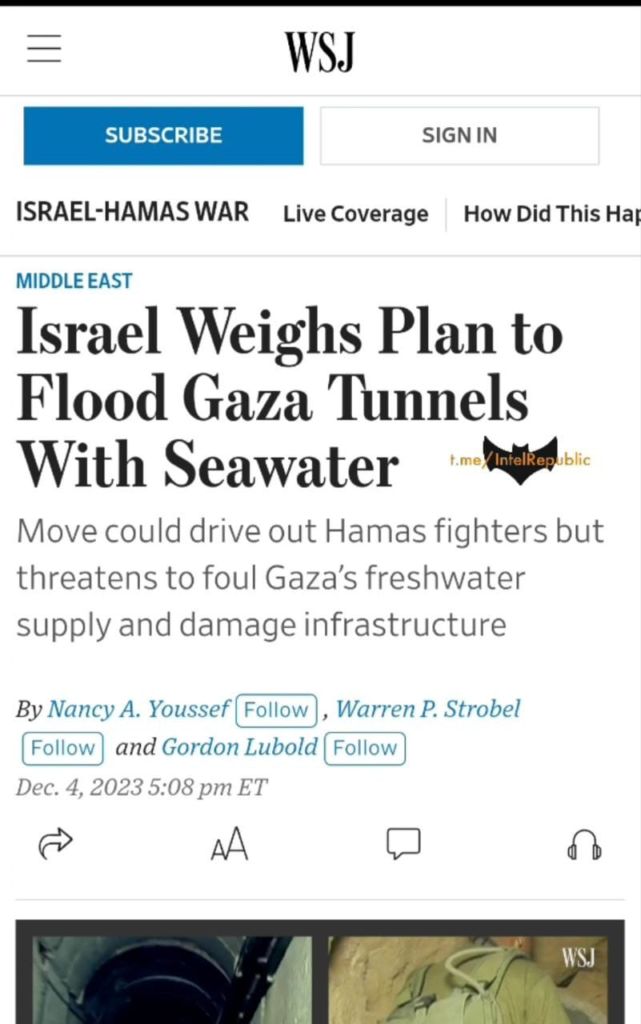 À noter: Les réticences d’une partie de l’état-major israélien, liées aux risques environnementaux induits par cette opération, l’un d’eux étant la salinisation des nappes aquifères qui fournissent Gaza en eau potable et qui rendrait les terres impropres à l’agriculture, un autre étant lié au risque d’instabilité des sols en surface après l’injection de telles quantités d’eau de mer, un dernier s’inquiétant de la pollution des terres via les substances nombreuses et variées susceptibles de se trouver à l’intérieur des tunnels.