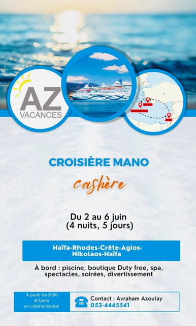 🚢 Croisière cachère Mano avec AZvacances : Dernières cabines… Du 2 au 6 juin !