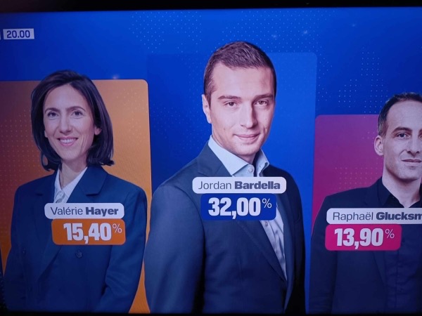 Alors qu’aujourd’hui les assesseurs dans tous les bureaux de vote avaient fait remarquer un afflux de primo et neo-votants et que les militants LFI remerciant déjà « les jeunes des quartiers », lorsqu’à 20 heures les résultats donnèrent un Jordan Bardella à 33% et faisant plus du double que le Groupe « Renaissance », le La était donné et il n’était plus question de s’interroger sur le score de « Reconquête » ou la quasi disparition des écologistes: juste noter, non sans satisfaction, les 9% de « La France Insoumise », et lever les yeux au ciel lorsque leur candidate hurla à la Tribune que le Président devait urgemment reconnaître l’Etat palestinien.