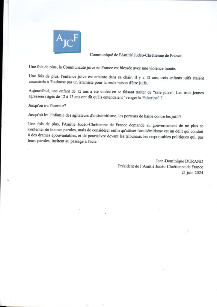 Je ne connaissais pas l’Amitié Judéo-chrétienne de France, je trouve que c’est très bien et j’approuve complètement ce communiqué. Les agressions et l’antisémitisme, tout le monde devrait se sentir concerné quel que soit sa religion. Nous devons être tous mobilisés et solidaires.