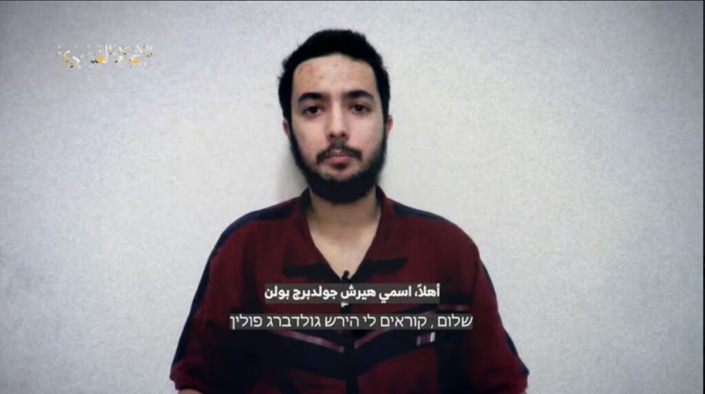 Contrairement à un précédent enregistrement publié par le Hamas en avril qui était en hébreu, Goldberg-Polin parle anglais dans cette dernière vidéo qui n’est pas datée.