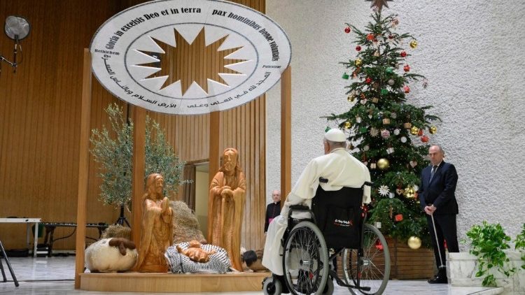 La rencontre qui précède l’inauguration aujourd’hui à 18h30 de l’arbre et de la crèche de Noël sur la place Saint-Pierre, constitue le premier acte de l’initiative « Nativité de Bethléem 2024« . Le Pape François a d’abord salué la délégation de Grado (dans le Frioul) et Ledro (dans le Trentin), d’où proviennent cette année la crèche et l’imposant épicéa de 29 mètres de haut; ainsi que la représentation de l’ambassade de l’État de Palestine près le Saint-Siège, «la Palestine martyre», qui est venue présenter, au nom de la Ville de Bethléem, cette «Nativité», réalisée par les artisans de Bethléem. Étaient également présents, des autorités civiles et ecclésiastiques, des représentants spéciaux du président de la Palestine, Mahmoud Abbas, le président du Conseil régional du Frioul-Vénétie Julienne et le président de la province de Trente.