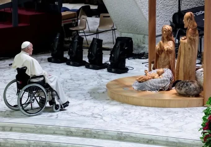 « L’église pour tous »: Le Pape prie devant l’Enfant Jésus emmitouflé dans un keffieh