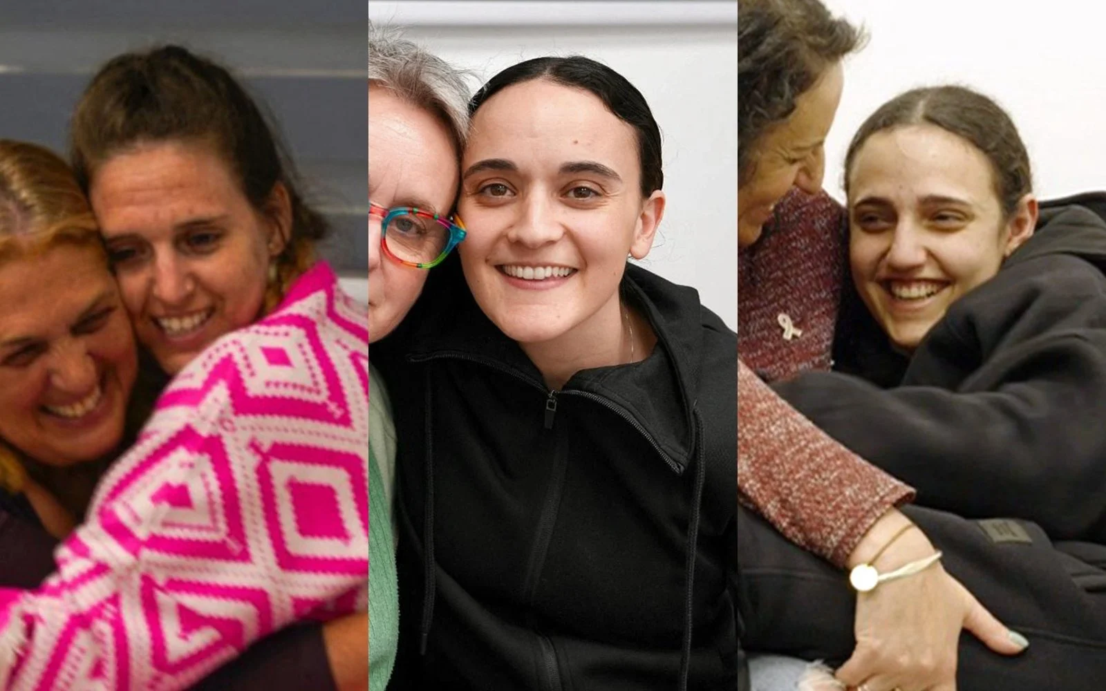 Les otages libérés (de gauche à droite) Doron Steinbrecher, Emily Damari et Romi Gonen retrouvent leurs mères peu après leur retour en Israël après 471 jours de captivité dans les geôles du Hamas à Gaza, le 19 janvier 2025. (Crédit : Tsahal)
