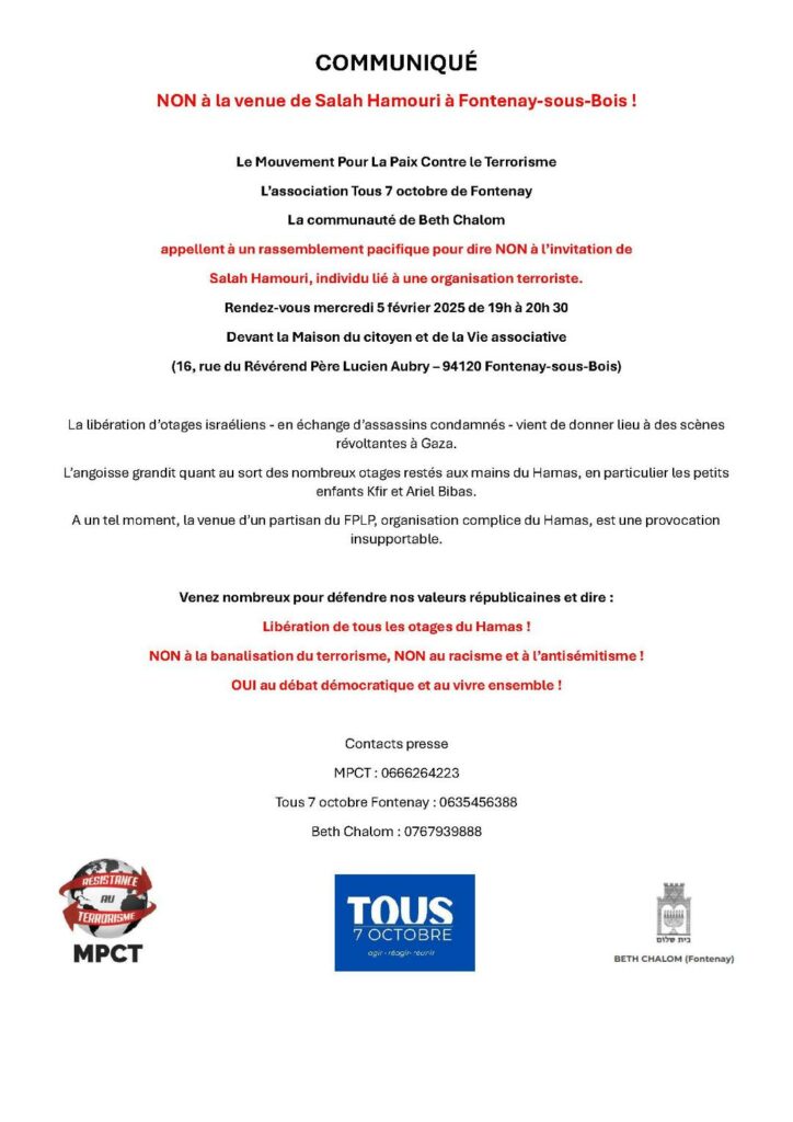 Non à la venue de Salah Hamouri à Fontenay-sous-Bois 4 février 2025 Tribune Juive 7 octobre 2023, Non classé 0 "Tous 7 octobre"Beth Chalom FontenayMPCTNon à la venue de Salah Hamouri à Fontenay-sous-BoisSuivez-nous et partagez