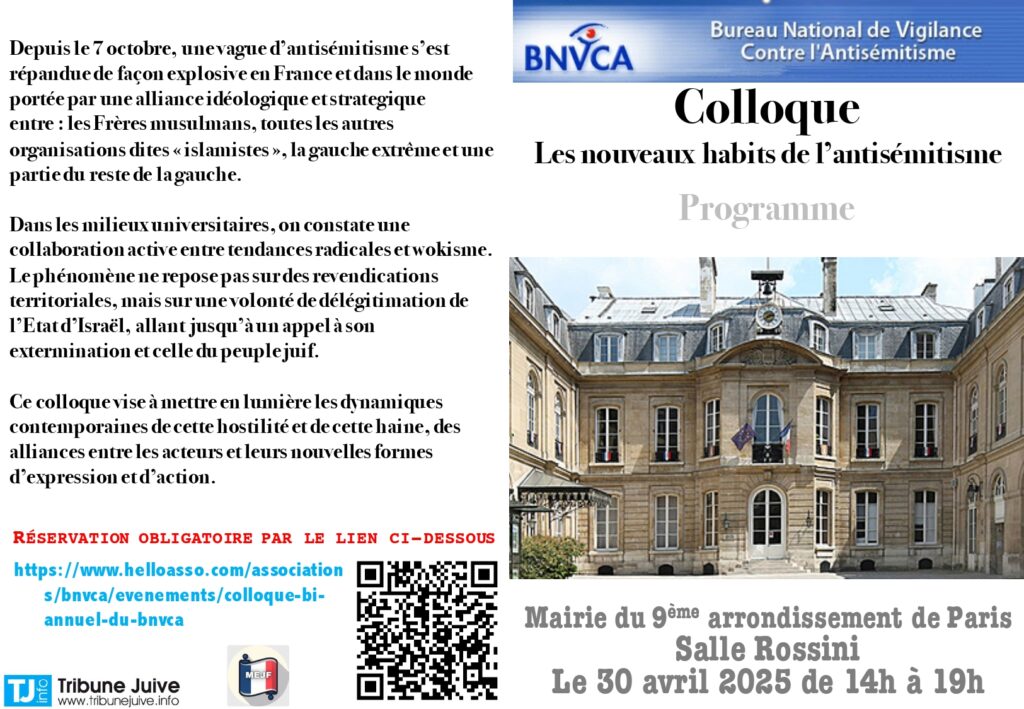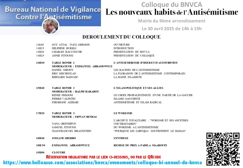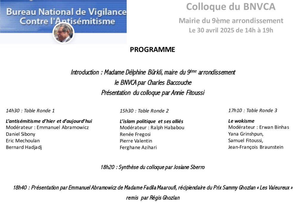 Colloque du BNVCA: « Les nouveaux habits de l’antisémitisme ». 30 avril 2025 16 avril 2025 Tribune Juive BNVCA 1 Screenshot "L'antisémitisme d'hier et d'aujourd'hui""L'islam politique et ses alliés""Le wokisme""Les nouveaux habits de l'antisémitisme"30 avril 2025Colloque du BNVCARemise du Prix Sammy Ghozlan "Les Valeureux" à Fadila MaaroufiTables rondesSuivez-nous et partagez