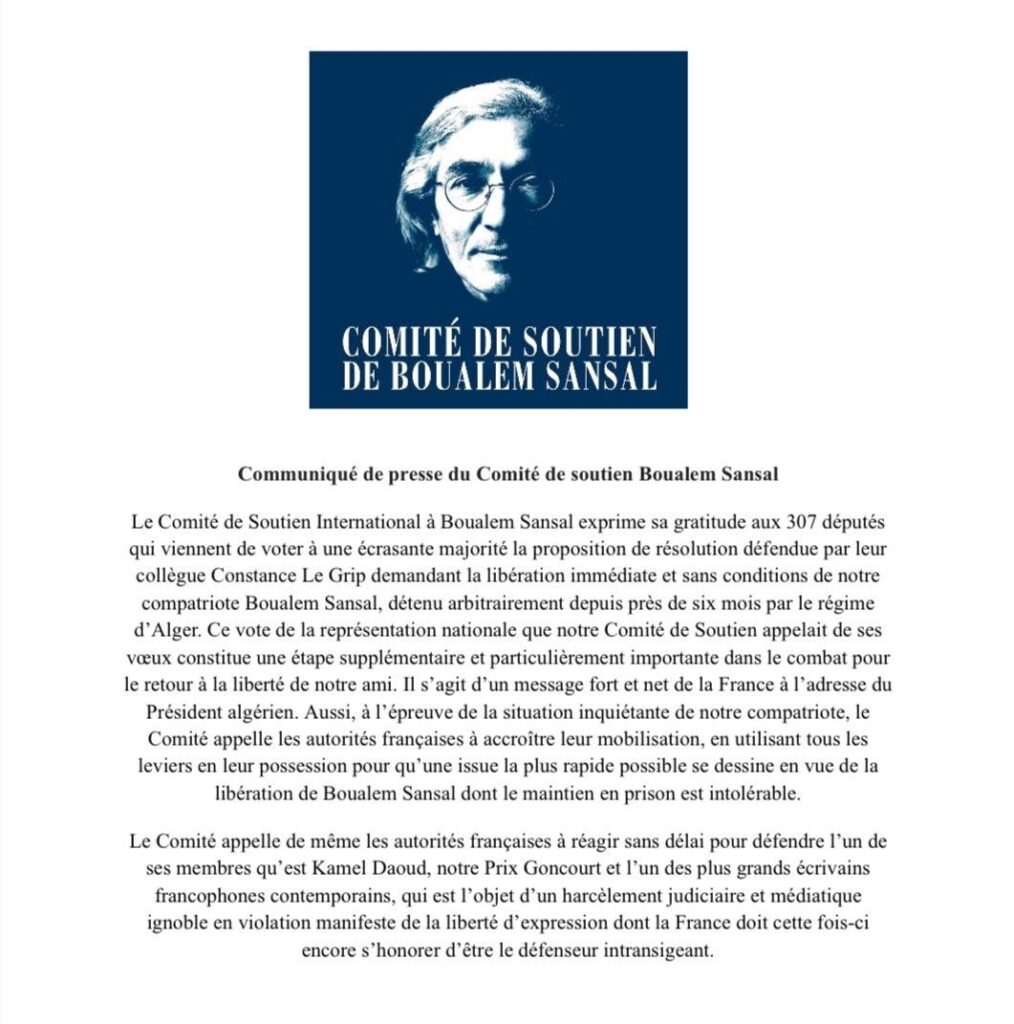 Le Comité de soutien international à Boualem Sansal remercie les 307 Députés…