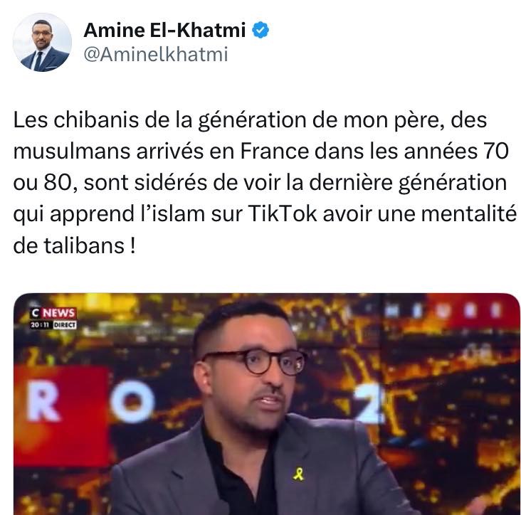 Les chibanis de la génération de mon père, des musulmans arrivés en France dans les années 70 ou 80, sont sidérés de voir la dernière génération qui apprend l’islam sur TikTok avoir une mentalité de talibans ! pic.twitter.com/NamVsHdGqg