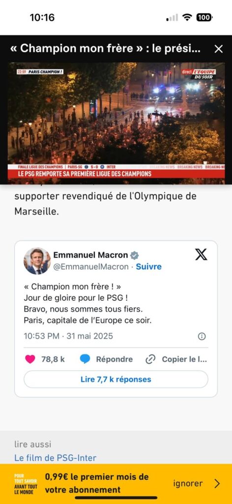 Macron déshonore et humilie la France. Un président qui tient un langage s’adressant aux racailles des cités « frère ». Bientôt il va parler le wesh-wesh, le langage des jeunes des cités. Il restera le pire président de la France. Il n’a jamais été à la hauteur de sa fonction de président. Un mauvais bilan dans tous les domaines, il a tout râté. Il a détruit la France. Son attitude d’adolescent immature, c’est laisser la place bien au chaud à Mélenchon et LFI, les islamistes. On ne voit pas une personnalité qui soit capable de redresser ce pays. Et pour les français, partir pour ceux qui en ont les moyens ou la possibilité. Pour les autres, essayer de s’isoler dans des régions ou campagnes peu peuplées où vivent des gens normaux. C’est désespérant.