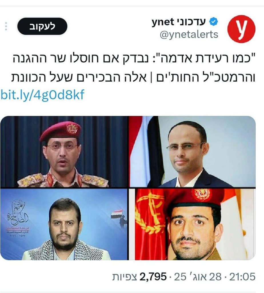 Un récapitulatif de la situation : les media locaux hostiles aux Houthis évoquent un « tremblement de terre », I24News et YNET font allusion (avec la prudence de mise) à l’événement majeur qui s’est passé hier : l’élimination d’une grande partie de l’état major des rebelles houthis. Une info confirmée par Tsahal