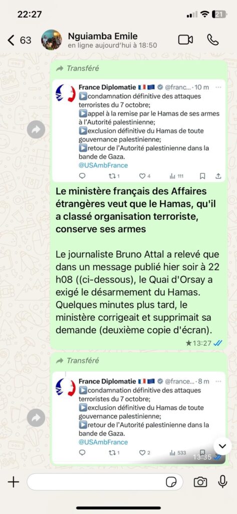 Et malheureusement et comble de lâcheté, le Ministre des Affaires Etrangères français veut que le Hamas qu’il a lui-même classé organisation terroriste, conserve ses armes (* pièces jointes).