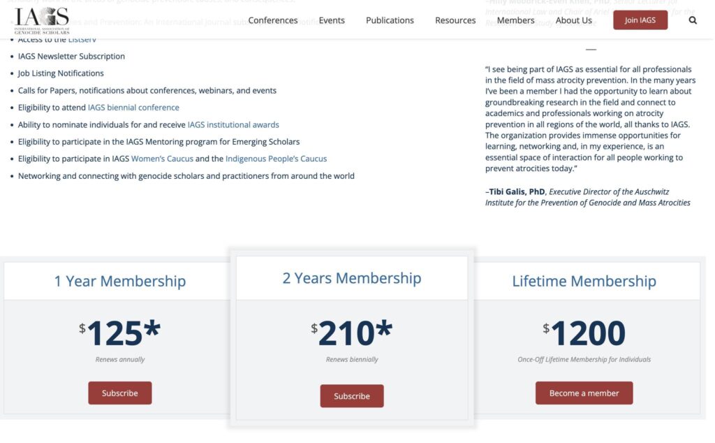 Je suis donc allé sur leur site (https://genocidescholars.org). Le site est bricolé, truffé de pages en erreur ; ce n’est pas, en soi, une preuve de quoi que ce soit — les universitaires ne sont pas nécessairement des as du web. Mais en ouvrant l’onglet « Join IAGS », on découvre qu’il suffit de s’acquitter d’une cotisation 125 $ pour un an, 210 $ pour deux ans ou 1 200 $ à vie pour devenir membre. J’ai donc tenté de payer 125 $ “pour voir”, sans succès : le site m’a renvoyé de page cassée en page cassée. J’ai, depuis, pu constater que d’autres ont pu aller au bout ( @Aizenberg55 , @AviBittMD par exemple) et se sont retrouvés, du seul fait de leur adhésion, « spécialistes du génocide » comme les autres membres — avec, en prime, accès à la liste des « experts », où certains noms de famille reviennent à répétition (toute une lignée de Mahmoud, visiblement soudain spécialistes).