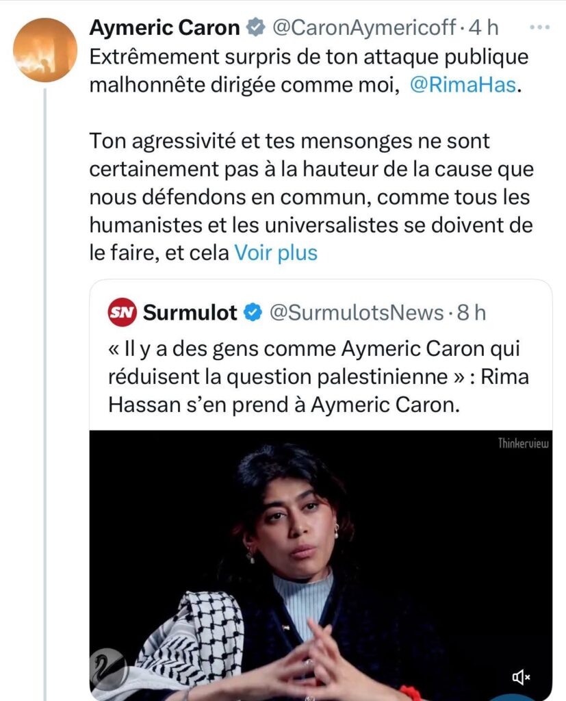 La grosse blague : Rima Hassan humaniste et universaliste ! Sauf pour les Juifs et tous ceux qui ne pensent pas comme elle ou dévie un peu de la doxa qu’elle impose et Caron en fait les frais. Et je jubile de voir que le défenseur des moustiques et autres fourmis soit dans le collimateur de Lady Gaza.