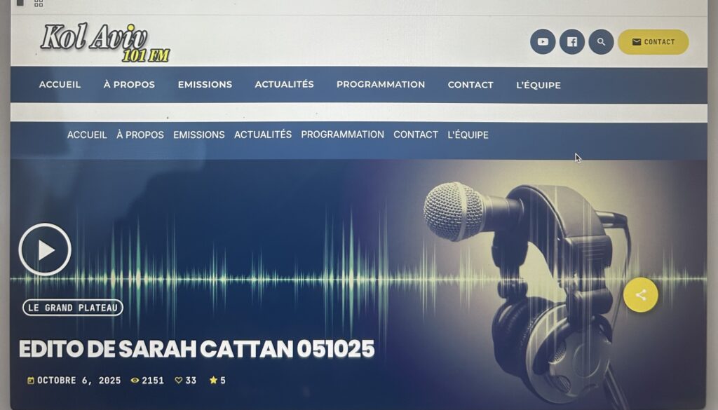 Le Partenariat Radio Kol Aviv-Tribune juive- Edito de Sarah Cattan 8 octobre 2025 Tribune Juive Partenariat Radio Kol Aviv-tribune juive 0 5 octobre 2025: Lettre à Boualem Sansal https://kolaviv.fr/podcast/edito-de-sarah-cattan-051025 "Critique de la déraison antisémite". Recueil publié sous la direction de Daniel Salvatore Schiffer5 octobre 2025Lettre à Boualem sansalpartenariatRadio Kol AvivSarah CattanTribune JuiveSuivez-nous et partagez