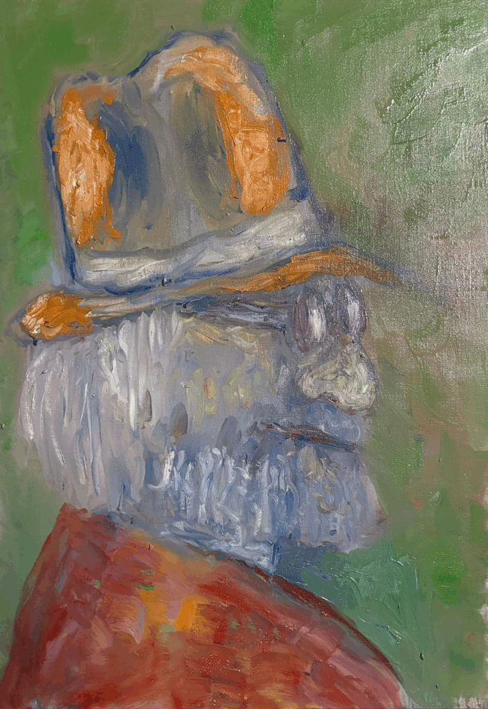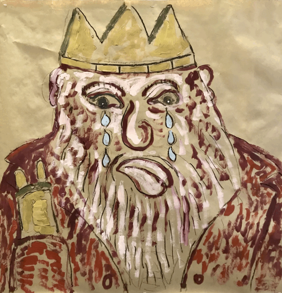 À travers l’ironie, l’autodérision et la subversion, il interroge la fragilité humaine et le poids des récits collectifs. Son personnage récurrent, « L’Homme du Roi », figure à la fois comique et tragique , incarne cette tension entre gravité et légèreté. Depuis la razzia-pogrom du 7 octobre l’artiste intensifie son geste: peinture rapide, matières brutes, formats réduits sur papier kraft recyclé. Une économie de moyens qui amplifie l’urgence expressive.