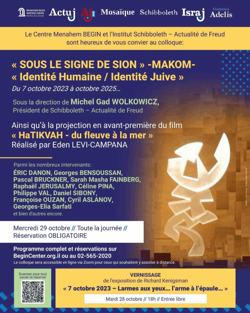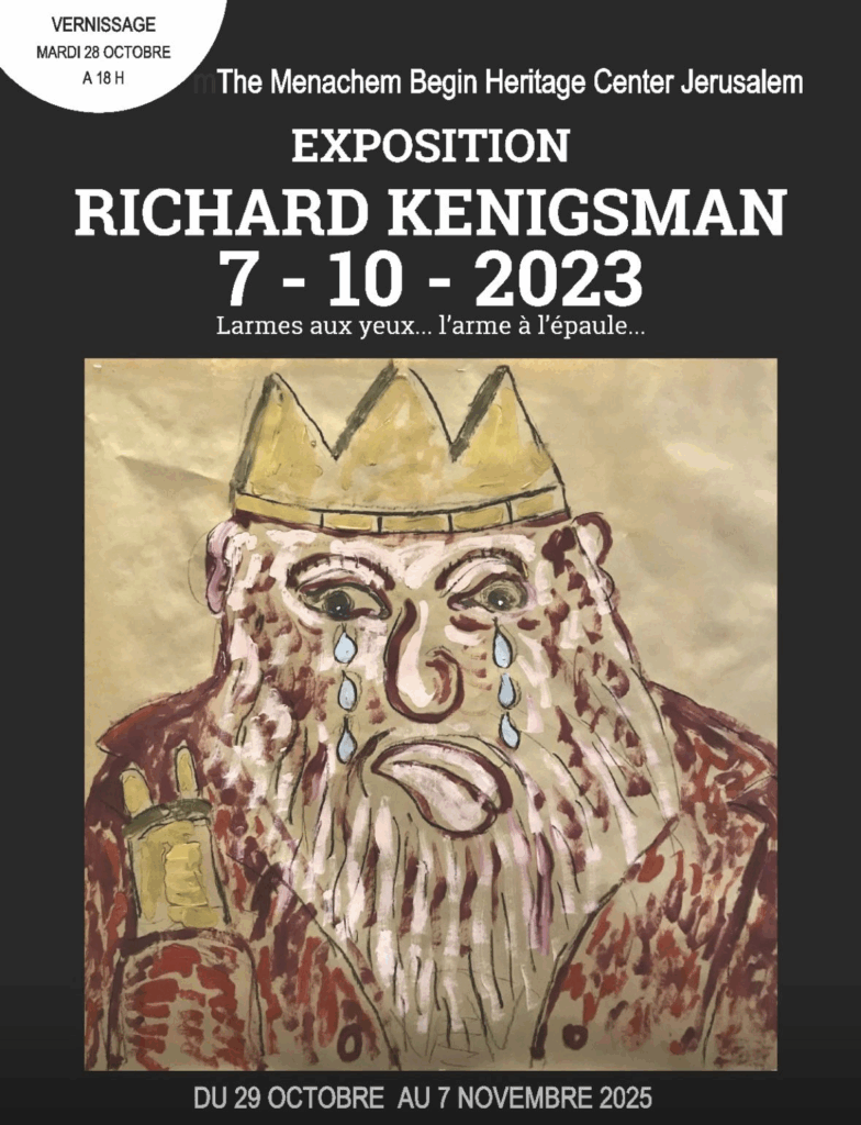 Exposition de Richard Kenigsman au Menachem Begin Heritage Center à Jérusalem, du 29 octobre 2025 au 7 novembre 2025, à l’occasion du colloque « SOUS LE SIGNE DE SION » -MAKOM–Identité Humaine/ Identité Juive », Du 7 octobre 2023 à octobre 2025. Sous la direction de Michel Gad Wolkowicz, Président de Shibboleth-Actualité de Freud
