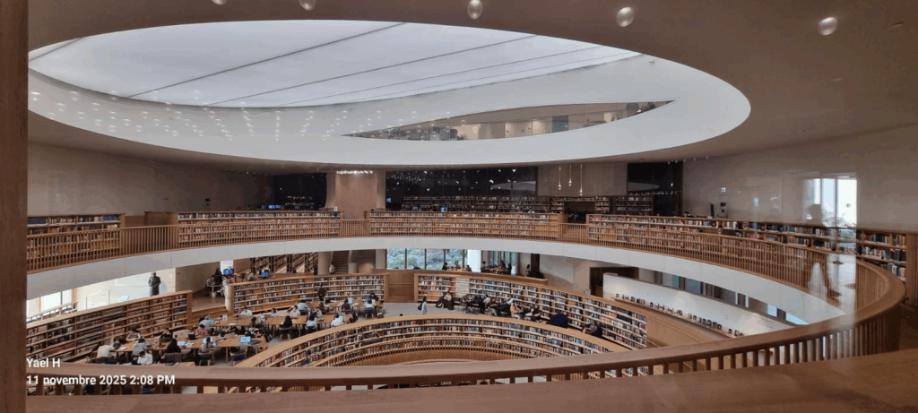 Voici un bâtiment moderne et audacieux, construit sur 11 étages, 5 étages lumineux en hauteur, qui présentent 50 000 ouvrages consultables par tous, et 6 étages souterrains qui abritent 5 millions de livres protégés dans des salles à atmosphère régulée de manière à éviter la dégradation du papier.