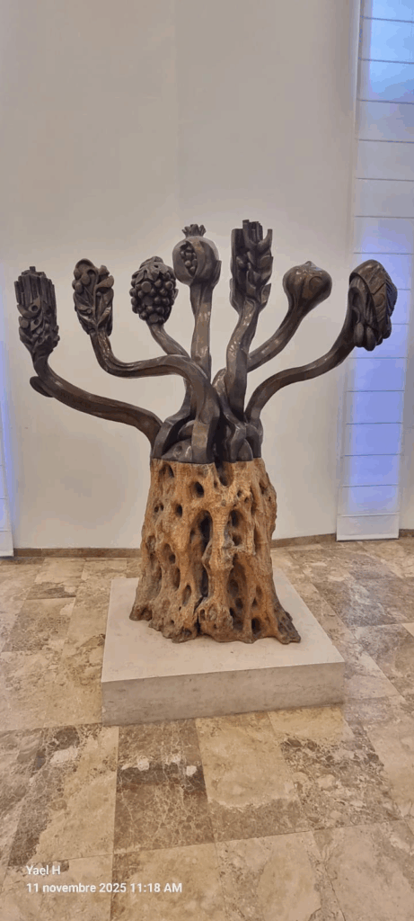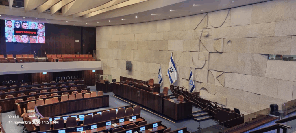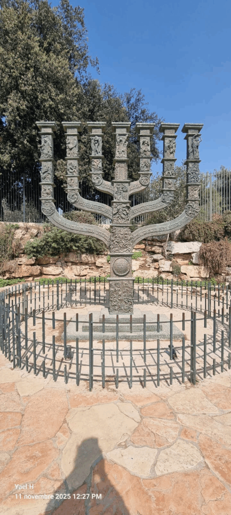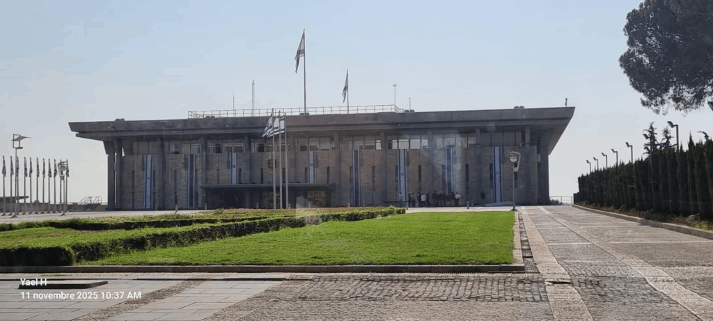 La Knesset, le Parlement de l’État d’Israël, est une chambre unique, composée de 120 membres élus directement, la construction de ce bâtiment iconique remonte à 1966, son emplacement actuel et son orientation ont été pensés à une époque où les Jordaniens occupaient encore l’est de la ville, c’est pourquoi l’esplanade fut placée à l’opposé des collines d’où les terroristes tiraient sur nous avant la réunification de juin 1967.