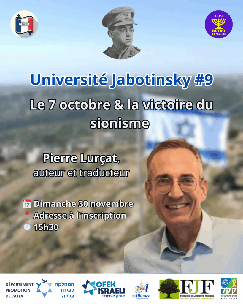 Le MEJF et le BÉTAR de France, avec le soutien de la Fondation du Judaïsme Français (FJF) et du KKL de France, ont le plaisir de vous convier au neuvième cours de l’Université Jabotinsky, le Dimanche 30 novembre à 15h30 (Paris 2ᵉ, adresse communiquée après inscription).