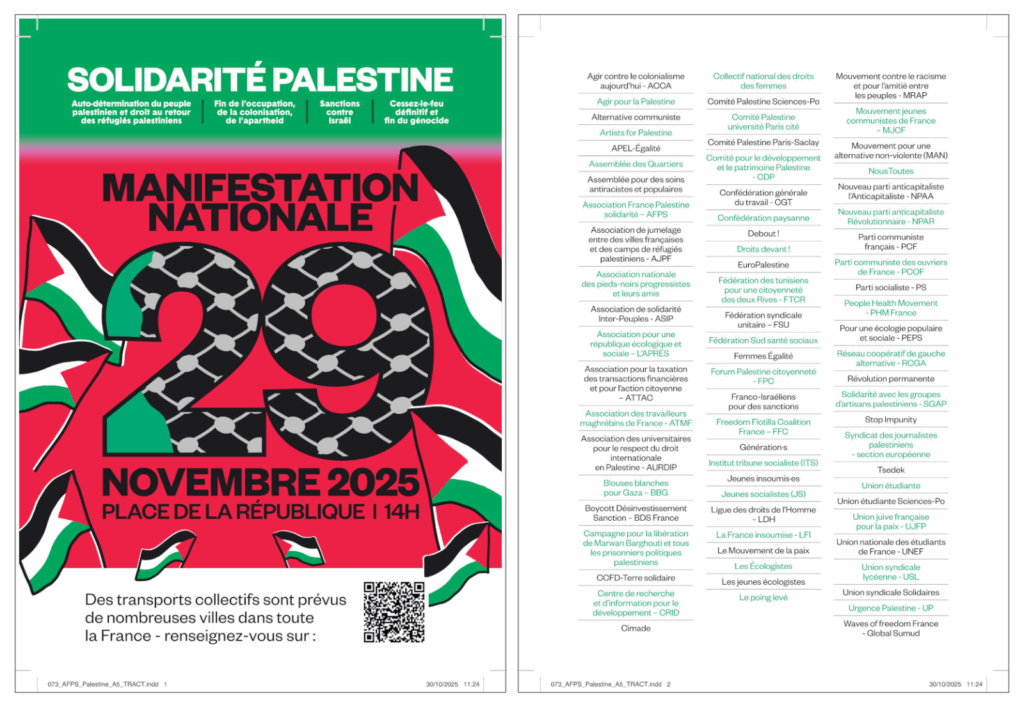 Les slogans mis en avant sur l’affiche officielle — « Auto-détermination du peuple palestinien et droit au retour des réfugiés palestiniens », « Fin de l’occupation, de la colonisation, de l’apartheid », « Sanctions contre Israël », « Cessez-le-feu définitif et fin du génocide » — relèvent d’un discours diffamatoire et négationniste, assimilant l’État d’Israël à un régime d’apartheid ou de génocide, en contradiction flagrante avec la réalité historique et juridique.