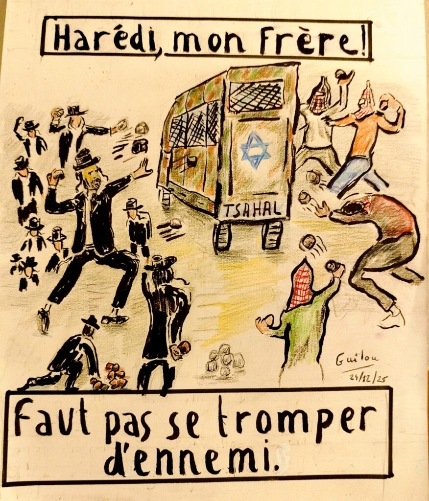 Dernièrement des orthodoxes participaient à une manifestation contre la conscription des Harédim. Des policiers qui encadraient la manif ont eu dans leur rang plusieurs blessés à coups de pierres que leur lançaient des manifestants, et même un car de militaires israéliens a reçu violemment des jets de pierre. Ces derniers événements se passent de commentaires.