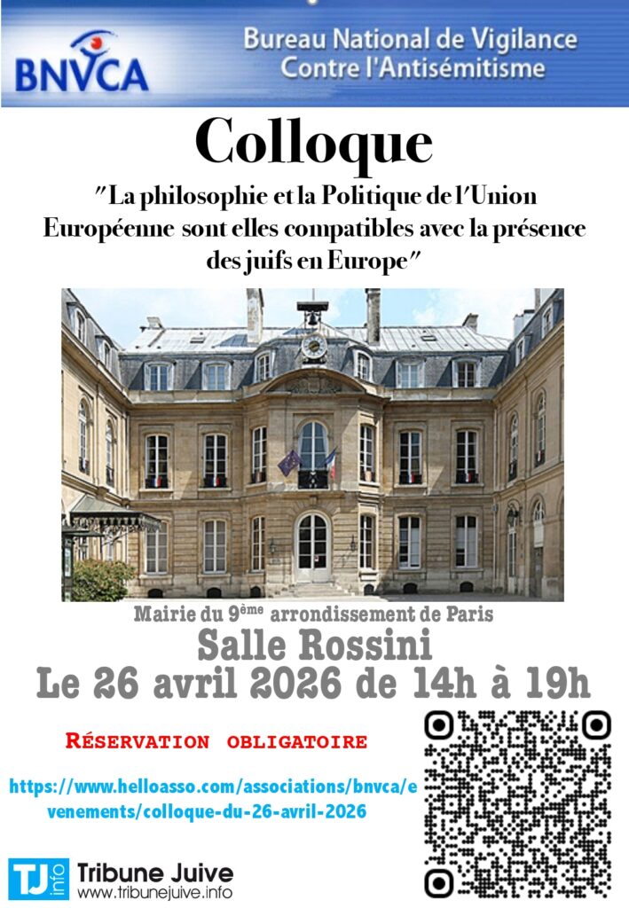 Le Colloque du BNVCA avec Tribune juive: 26 avril 2026 Paris Tribune Juive il y a 7 heures « La philosophie et la Politique de l’UnionEuropéenne sont elles compatibles avec la présencedes Juifs en Europe »