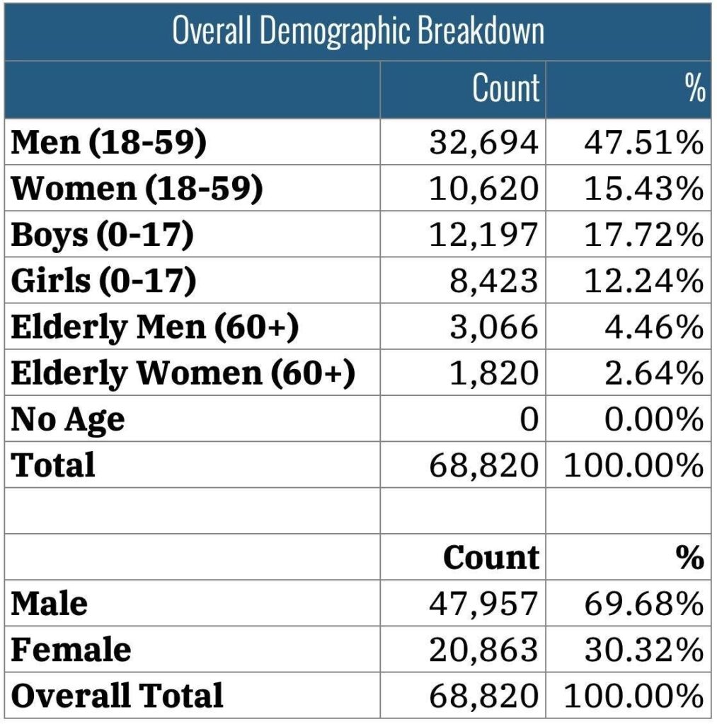 L’écart avoisine 27 000 personnes. Il est probable qu’il corresponde en grande partie à des hommes engagés dans les groupes armés, y compris de jeunes hommes de 16 à 18 ans recrutés par les organisations islamistes, ainsi que des hommes plus âgés.