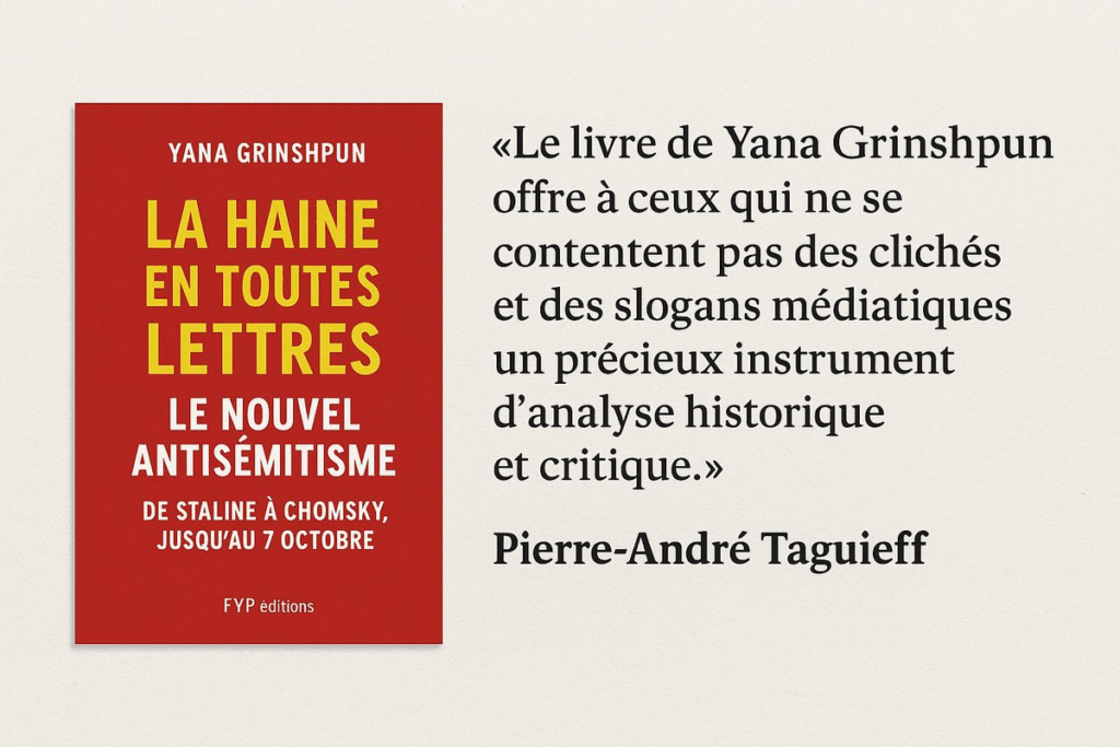 [i] Yana Grinshpun est une linguiste israélienne originaire de Russie. Maître de conférences à la Sorbonne nouvelle. Energique dé-constructrice des manipulations et victimisations dans les discours militants antisémites, Yana vient de faire publier aux éditions FYP son livre : “la haine en toutes lettres, le nouvel antisémitisme de Staline à Chomsky, jusqu’au 7 octobre”. On peut également consulter sa chaine Youtube “Perditions idéologiques“.
