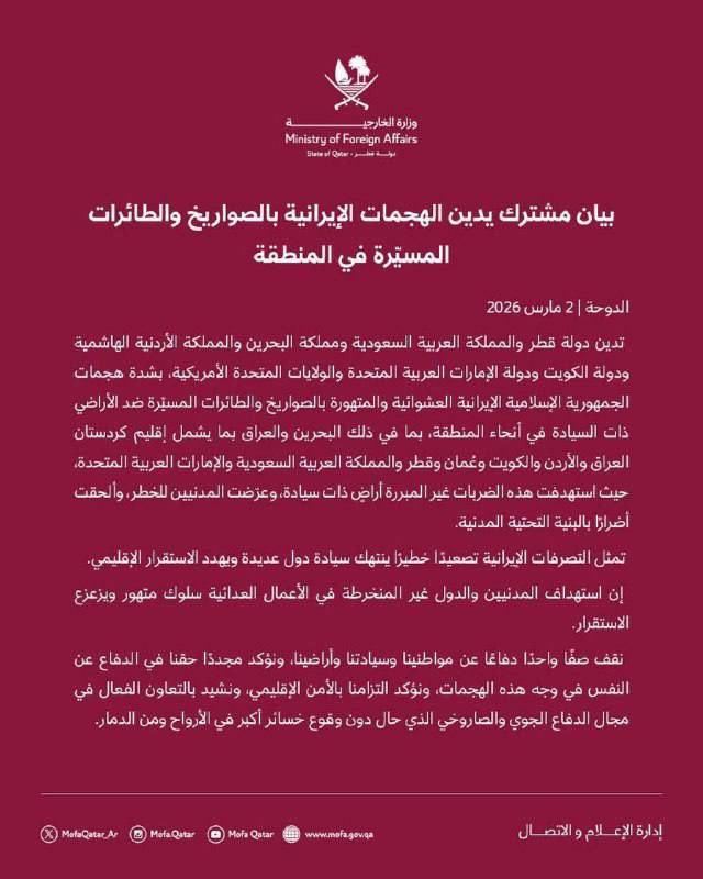 « Les attaques iraniennes contre le Qatar, les Émirats arabes unis, Bahreïn et Oman témoignent d’une perte totale de contrôle du régime. Il est probable qu’au moins une partie des frappes soit due à des missiles et des drones ciblant des bases américaines et ayant dévié de leur trajectoire ou à des débris d’interceptions, mais il semble qu’il n’y ait pas d’adulte responsable prenant les décisions à Téhéran, ou que le régime soit entré dans un mode « je meurs avec les Philistins ». Tamir Morag
