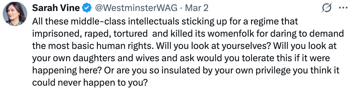 “Stop killing kids!” they scream, the same meaningless screams for the last three years about Gaza. What about: stop radicalizing kids. How about that? Stop the Islamists from radicalizing their own children, and while we’re at stop progressives in the West from doing the same. (Need I be specific? You know what I mean.) A school is hit in Iran, and the details have yet to emerge about how it happened, and suddenly it’s all the international law crowd care about. Where were they when Iranian school girls were being beaten till they bled for not covering their hair properly? Where were they when Iranian school girls were having their eyes gouged out and their faces spoiled for life in acid attacks? WHERE WERE THEY?