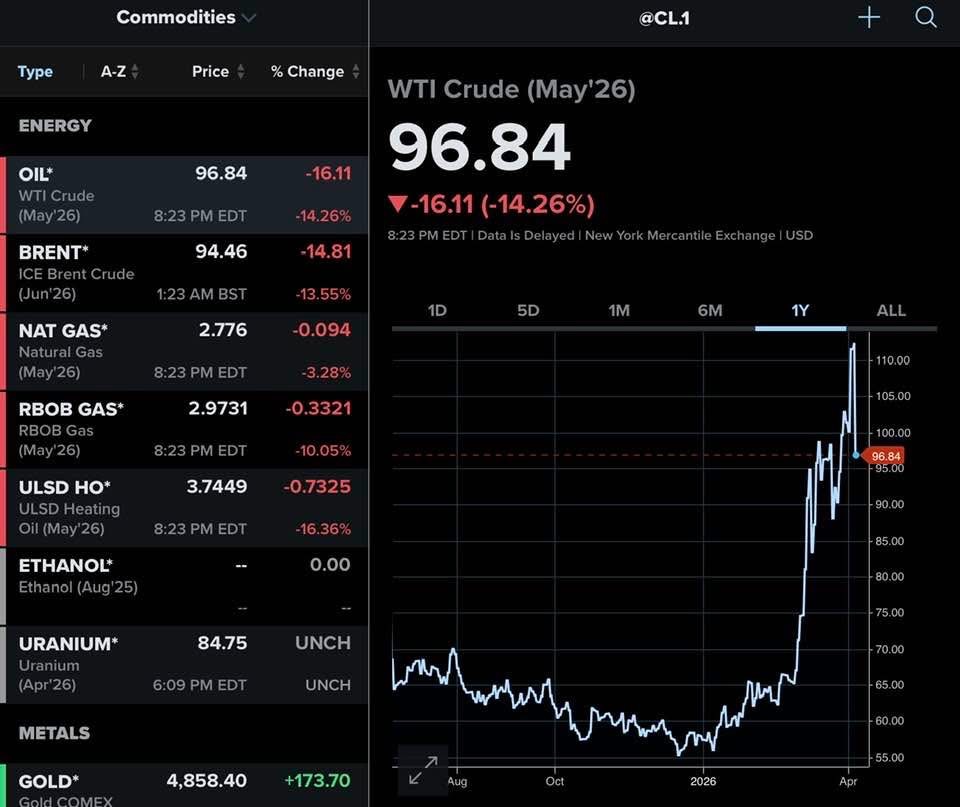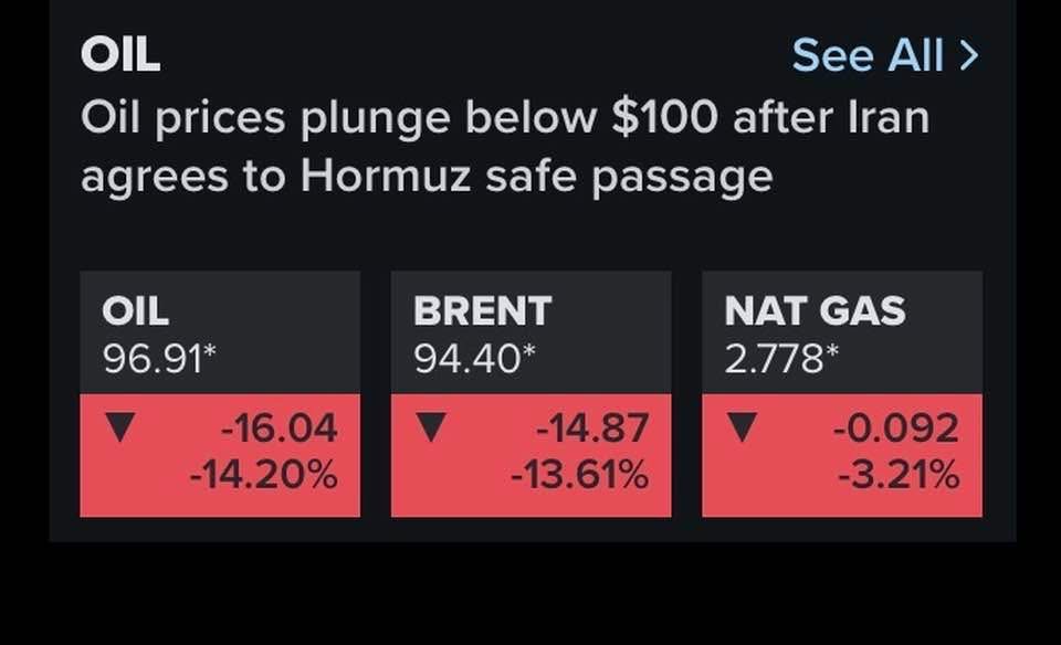 Le pétrole perd plus de $16 le baril, presque 15% à moins de $97, le détroit d’Ormuz est ouvert, les spéculateurs perdent leurs culottes, mais vous verrez que le prix à la pompe ne baissera pas d’autant car le gouvernement est addict aux taxes ! Le Brent et le gaz naturel plongent aussi.