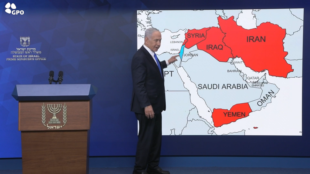 Je veux que vous vous souveniez d’où nous venions – l’Iran a essayé de nous étrangler dans un étau ; le Hamas à Gaza, le Hezbollah au Liban, le régime Assad en Syrie, les milices en Irak, les Houthis au Yémen, l’Iran elle-même. Autrement dit, ils voulaient nous étrangler – et nous les étouffons. Ils nous ont menacés d’extermination – et maintenant ils luttent pour survivre. Nous les avons frappés. Il nous reste encore du travail à faire, et je vais bientôt le détailler, mais je veux commencer justement par l’Iran elle-même, la tête de la pieuvre, car j’ai consacré une grande partie de ma vie à empêcher une chose : que ce régime menaçant obtienne une arme nucléaire avec laquelle il cherche à anéantir l’État juif et mettre fin à l’histoire juive.