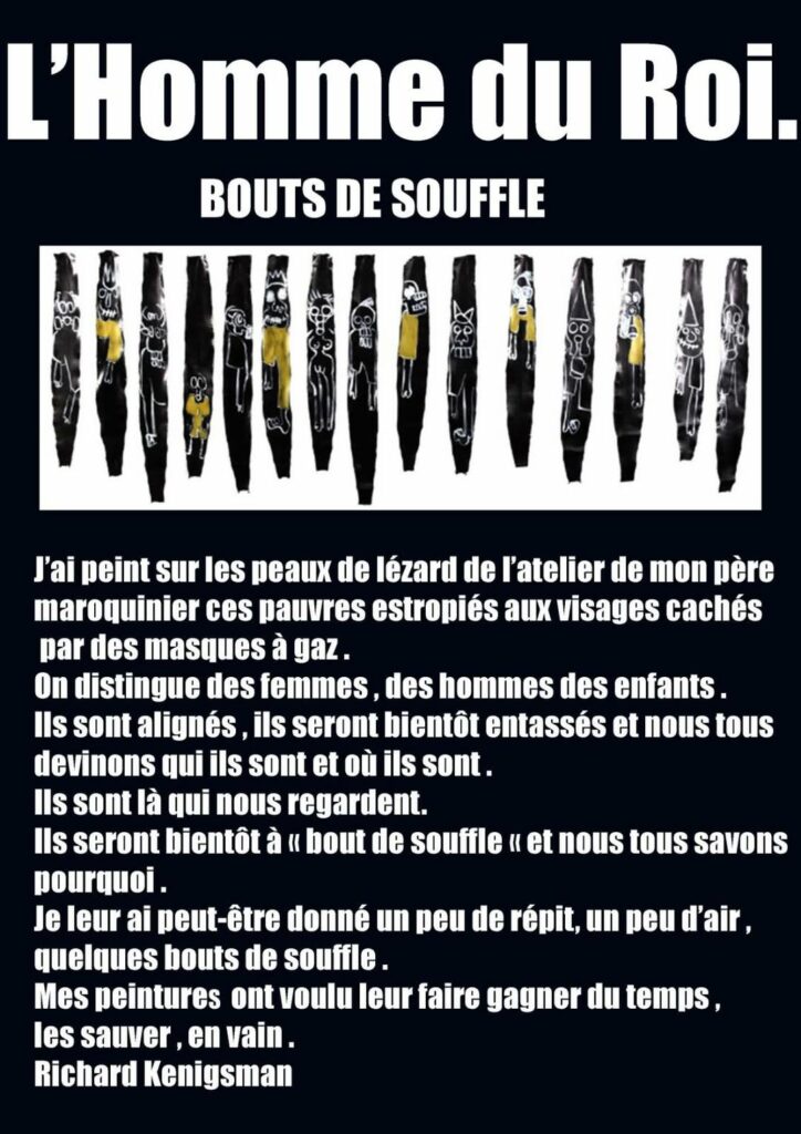 J’ai peint sur les peaux de lézard de l’atelier de mon père maroquinier ces pauvres estropiés aux visages cachés par des masques à gaz . On distingue des femmes , des hommes des enfants . Ils sont alignés , ils seront bientôt entassés et nous tous devinons qui ils sont et où ils sont .Ils sont là qui nous regardent. Ils seront bientôt à « bout de souffle « et nous tous savons pourquoi . Je leur ai peut-être donné un peu de répit, un peu d’air , quelques bouts de souffle . Mes peinture ont voulu leur faire gagner du temps , les sauver , en vain . En cette période de déconfinement, j’enlève mon masque et je pense à eux. Kenigsman. 18 mai 2020