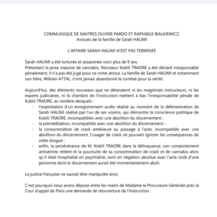 Dans leur communiqué, les avocats de la famille de Sarah Halimi assurent disposer d' »éléments nouveaux que ne détenaient ni les magistrats instructeurs ni les experts judiciaires ni la chambre de l’instruction » et qui « mettent à bas l’irresponsabilité pénale » du mis en cause.