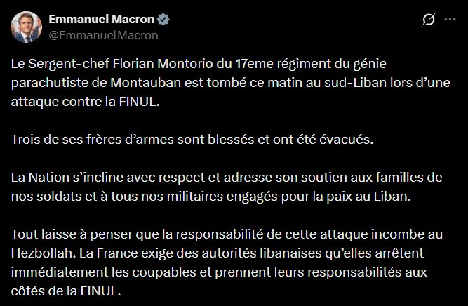 Le tweet de Macron résume à lui seul cette faillite. Il dit que tout laisse à penser que le Hezbollah est responsable, puis appelle les autorités libanaises à arrêter les coupables et à prendre leurs responsabilités. Autrement dit, il désigne une organisation terroriste comme auteur probable, puis s’en remet à un État libanais qui n’a ni l’autorité ni les moyens d’imposer sa loi au Hezbollah dans les zones où celui-ci opère. Ce n’est pas de la fermeté. Ce n’est même pas de la lucidité. C’est de l’impuissance maquillée en discours officiel.