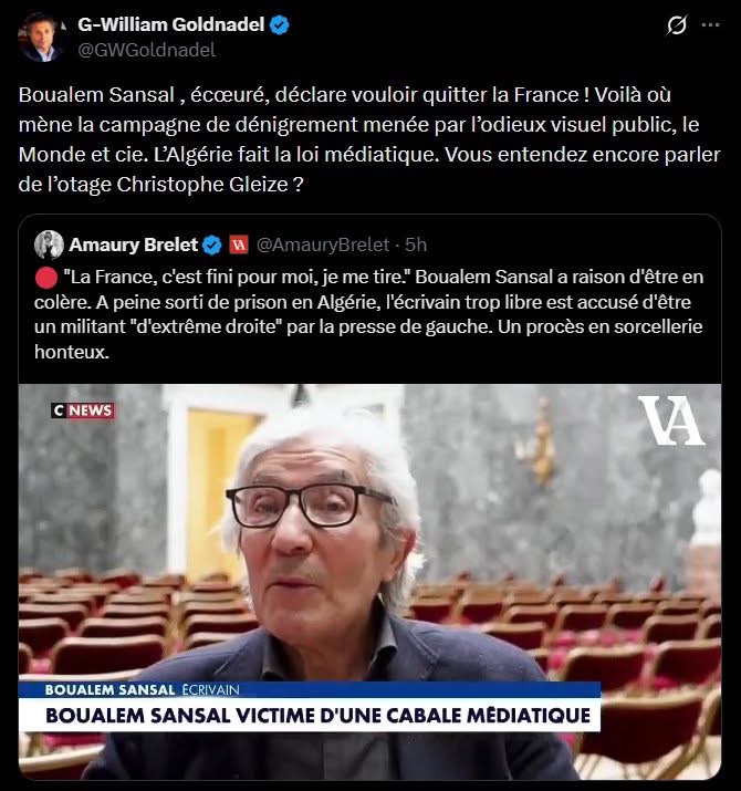 Et c’est là que la blessure est profonde : il retrouve en France, chez une partie du monde médiatique et intellectuel, ce qu’il pensait avoir laissé de l’autre côté de la Méditerranée : la disqualification, le procès d’intention, l’étiquetage infamant, la mise au ban. Je mets d’ailleurs au défi ce microcosme intellectuel, saturé de relativisme culturel, d’indignation sélective et d’empathie mal placée, d’aller vivre durablement dans un pays comme l’Algérie, en y tenant les mêmes postures morales qu’il se permet confortablement depuis la France. Ce microcosme gaucho-bobo, qui fantasme certaines réalités bien plus qu’il ne les comprend, ne voit même pas qu’il contribue à affaiblir les libertés dont il profite encore. Il croit protéger les autres ; il prépare surtout le terrain d’un monde où ses propres enfants n’auront plus le droit de parler aussi librement que lui.